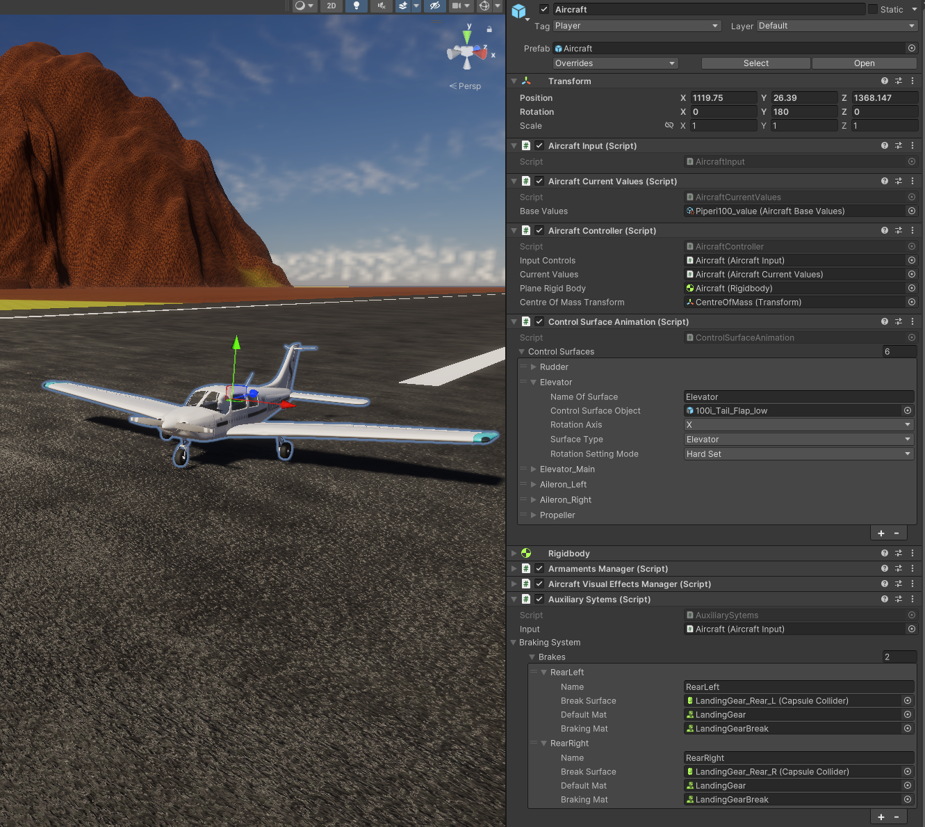 These forces were applied directly to the aircraft’s Rigidbody, producing believable flight behaviour driven by physics rather than hard constraints.