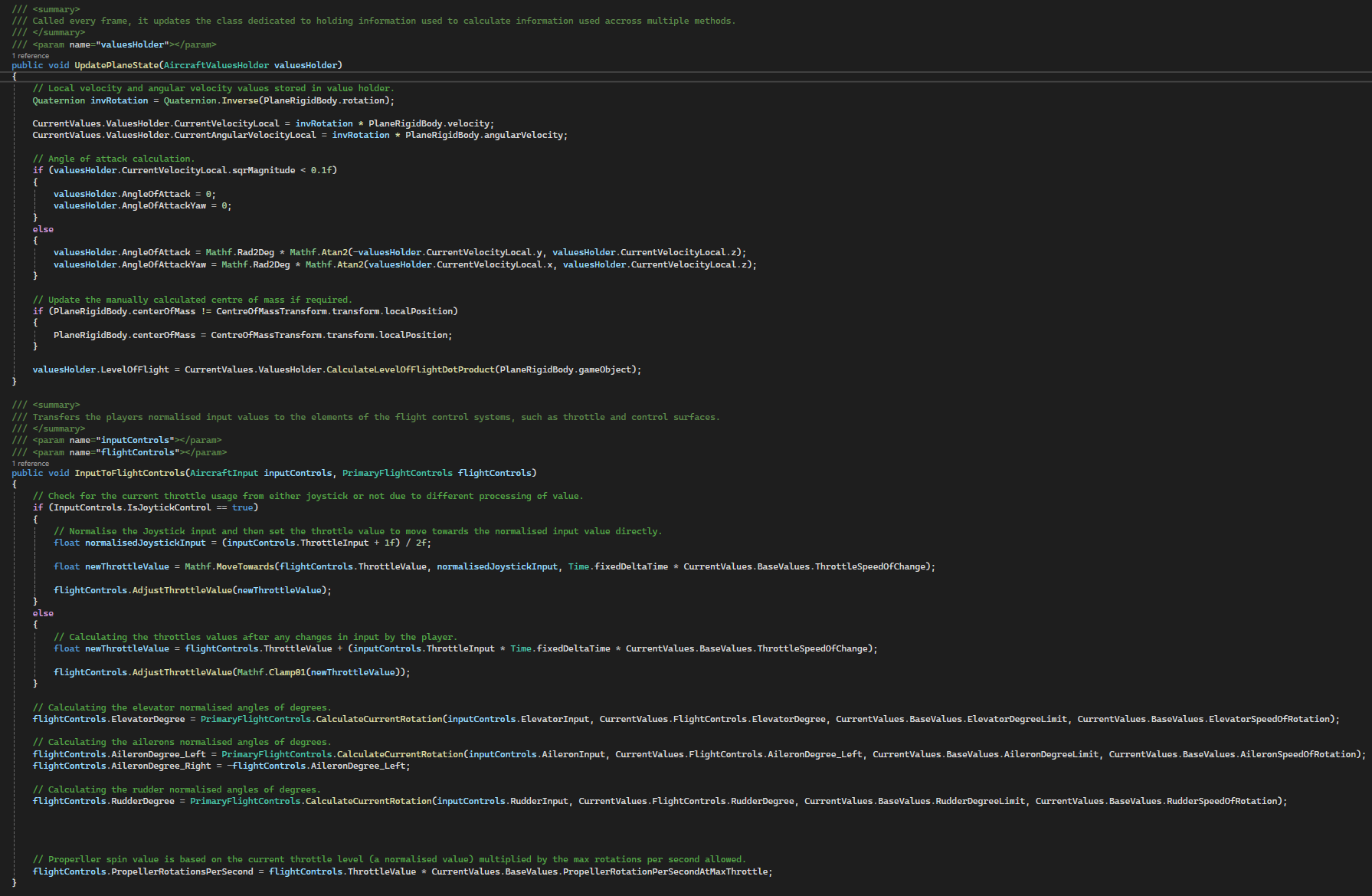 This Aircraft Controller script formed the core of my Skyborne flight simulation, acting as the bridge between player input, aerodynamic modelling, and Unity’s physics system.